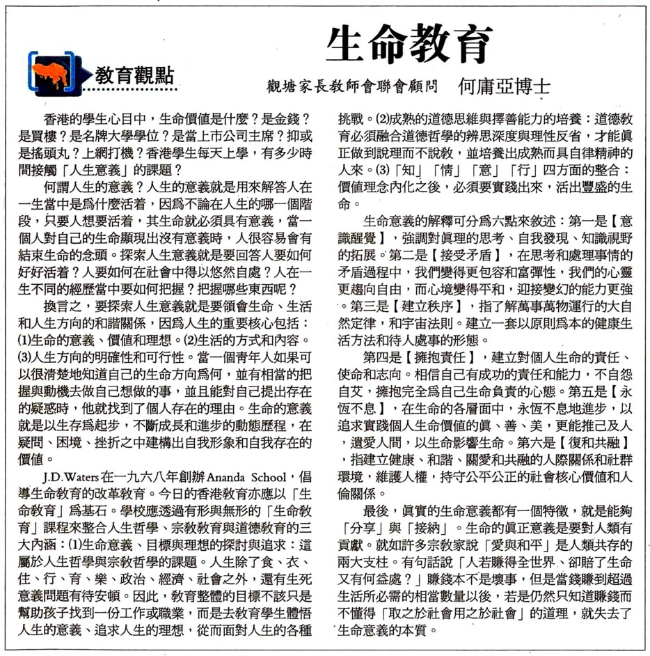 生命教育文章 (本會顧問何庸亞博士撰文)