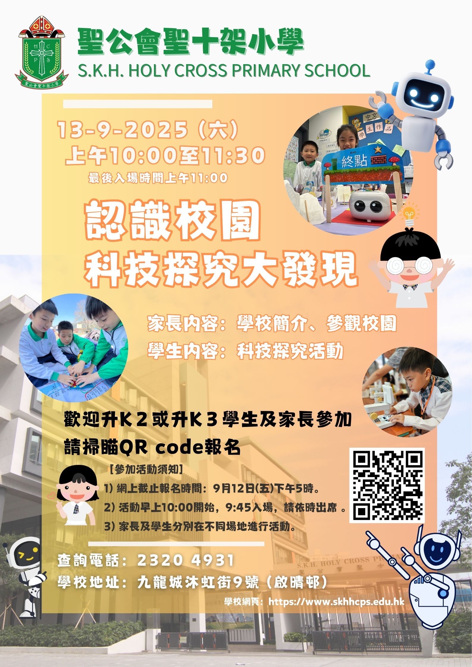 | 时间 | 上午10:00至11:30 ﹝學校簡介及科技探究活動於上午10:00開始﹞ |