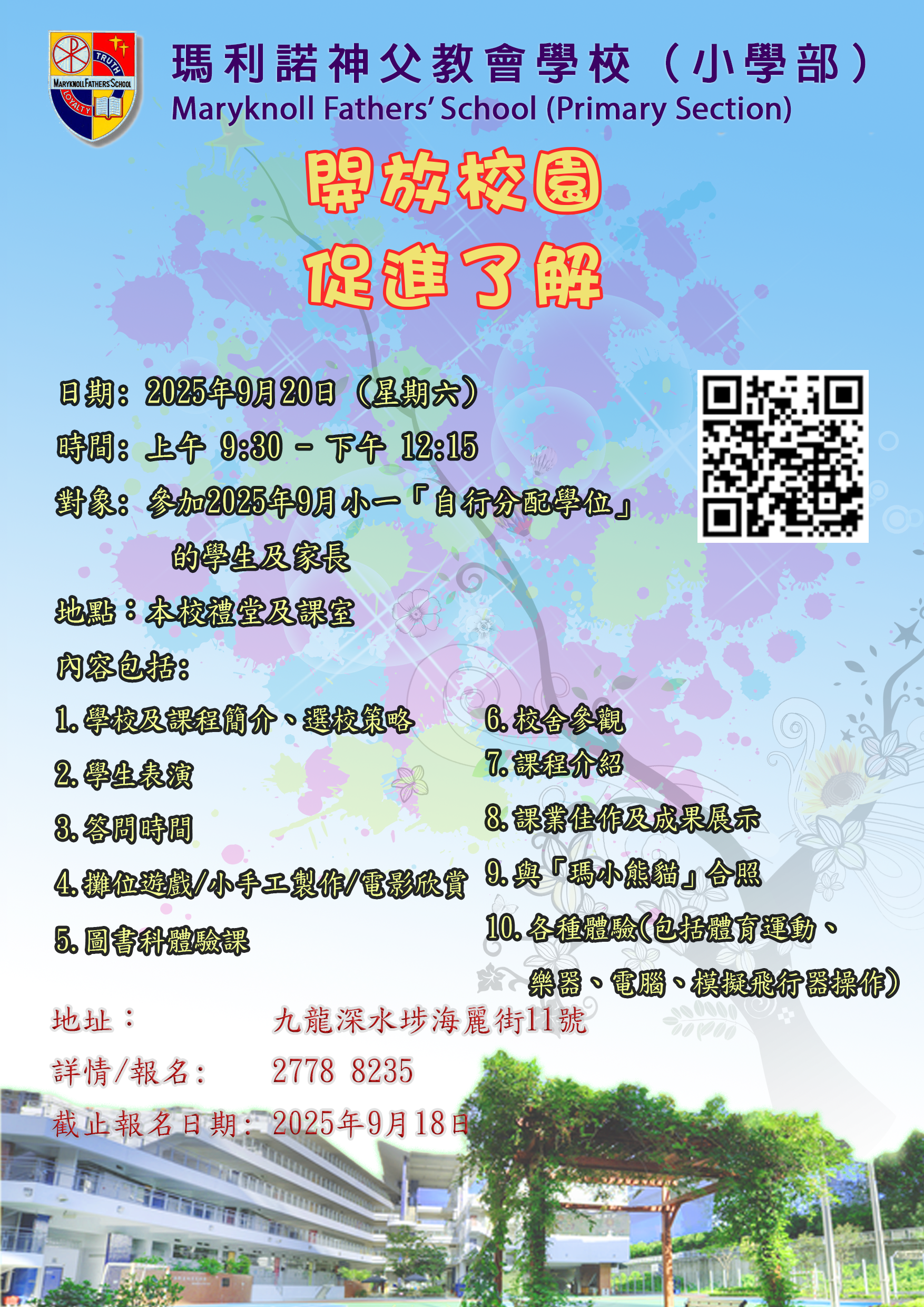 | 备注 | 鑑於二零二六年小一「自行分配學位」將於九月下旬接受申請,為使家長對本校有更深入了解,現特安排「開放校園.促進了解」參觀活動,歡迎家長撥冗出席,詳情如下: 日期:2025年9月20日(星期六) 時間:上午9時30分至下午12時15分 對象:於本年九月參加小一「自行分配學位」的幼稚園生及其家長 報名辦法: (一) 致電本校電話 27788235 (二) 網上報名:https://forms.gle/wXaruUc69g3sUs1H8 *為避免重複報名,請選擇其中一種報名方法。 截止報名日期:2025年9月18日(星期四),先到先得,額滿即止。 註: 查詢活動詳情,請致電2778 8235與校務處職員聯絡。 |