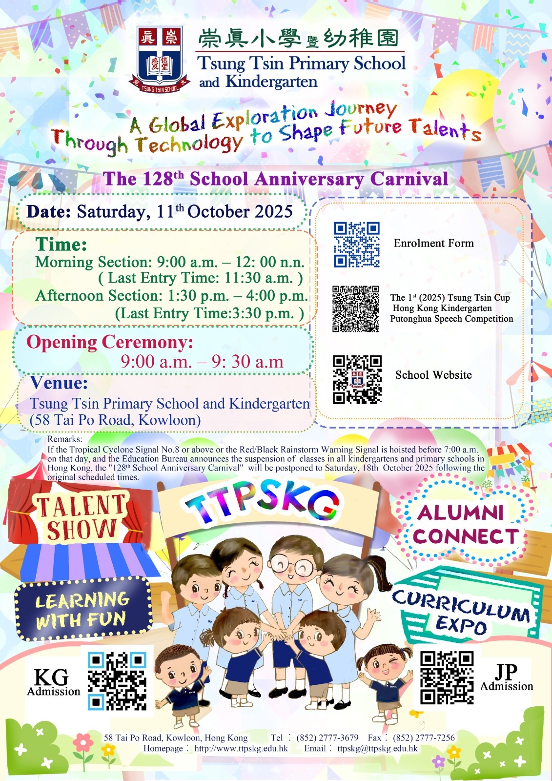| Remarks | Tsung Tsin Primary School and Kindergarten's '128th School Anniversary Carnival' will be held on Saturday, 11th October 2025. Parents are cordially invited to bring along their children to the school to participate in the fun learning games! If you are interested in joining the Carnival, please scan the QR code of the 'Enrolment Form' on the leaflet or click the link below and fill in the information required. https://forms.gle/LV2xHNVVNDFcXDnMA Please be informed of the crowd control and traffic arrangements on the day of the Carnival: 1. Activity Periods: -Opening Ceremony - 9:00 a.m. - 9:30 a.m. -Morning Session - 9:00 a.m. - 12:00 noon (Last admission - 11:30 a.m.) -Afternoon Session - 1:30 p.m. - 4:00 p.m. (Last admission - 3:30 p.m.) 2. No parking spaces will be available. 3. Parents are encouraged to use public transport to go to the school, or park your vehicles at Sai Yeung Choi Street North and walk back to the school. 4. If the Tropical Cyclone Signal No.8 or above or the Red/Black Rainstorm Warning Signal is hoisted before 7:00 a.m. on that day, and the Education Bureau announces the suspension of classes in all primary schools in Hong Kong, the '128th School Anniversary Carnival' will be postponed to Saturday, 18th October 2025 following the originally scheduled times. For enquiries, please contact Ms. LUI Ally at 2777-3679. Tsung Tsin Primary School and Kindergarten |