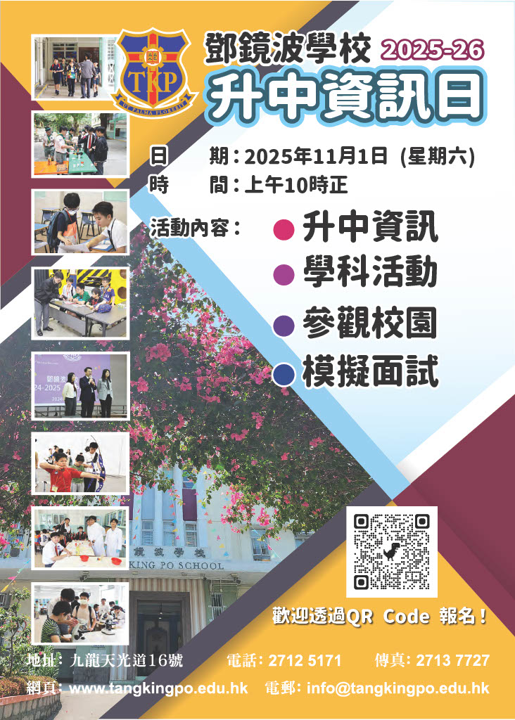 | 备注 | 由本校舉辦的『升中資訊日』節目內容豐富,除了大型入學講座,還有模擬面試、活動體驗、聯校比賽等,旨在讓小六學生親身體驗本校的生活及文化。當日亦設有家長聚會,讓家長和學生能夠全方位認識本校! 由於各項活動反應熱烈,敬請家長儘快透過二維碼報名,為子女的升中做好準備! |