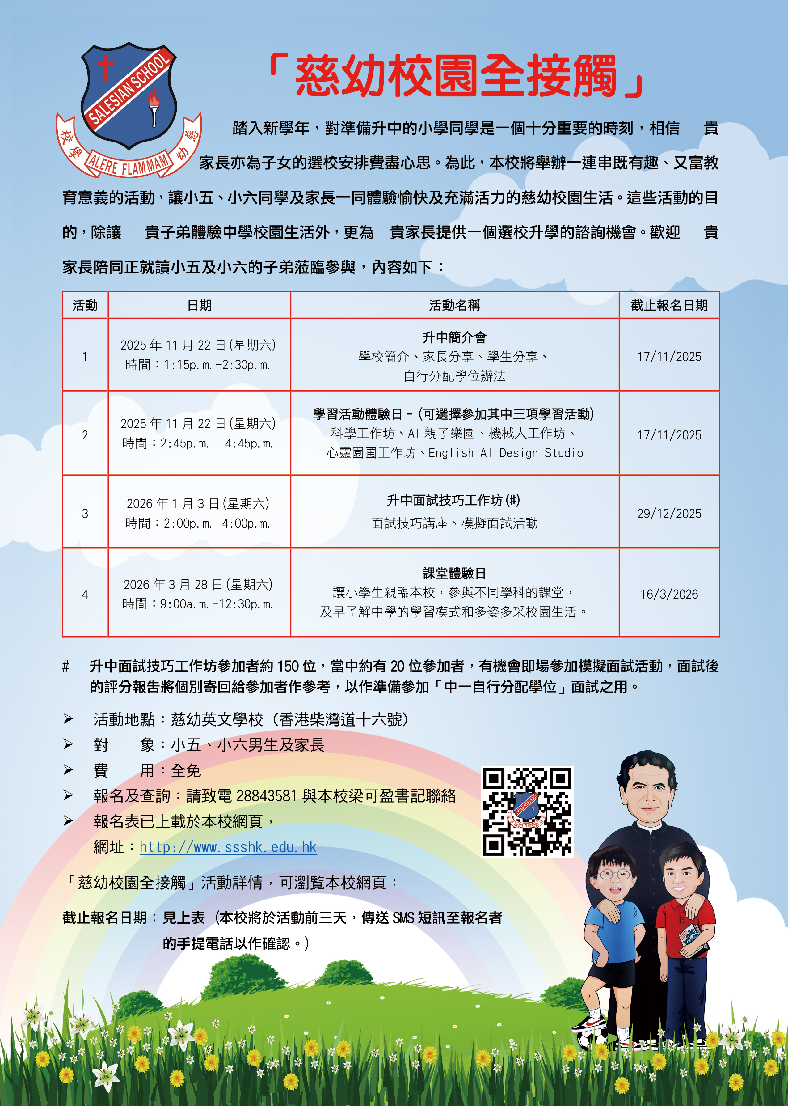 | 备注 | 踏入新學年,對準備升中的小學同學是一個十分重要的時刻,相信 貴家長亦為子女的選校安排費盡心思。為此,本校將舉辦一連串既有趣、又富教育意義的活動,讓小五、小六同學及家長一同體驗愉快及充滿活力的慈幼校園生活。這些活動的目的,除讓貴子弟體驗中學校園生活外,更為家長提供一個選校升學的諮詢機會。歡迎家長陪同正就讀小五及小六的子弟蒞臨參與。 對 象:小五、小六男生及家長 費 用:全免 報名方法: (i) 可直接致電本校(28843581)與梁可盈書記聯絡 (ii) 報名表已上載於本校網頁 ( http://www.ssshk.edu.hk ) |