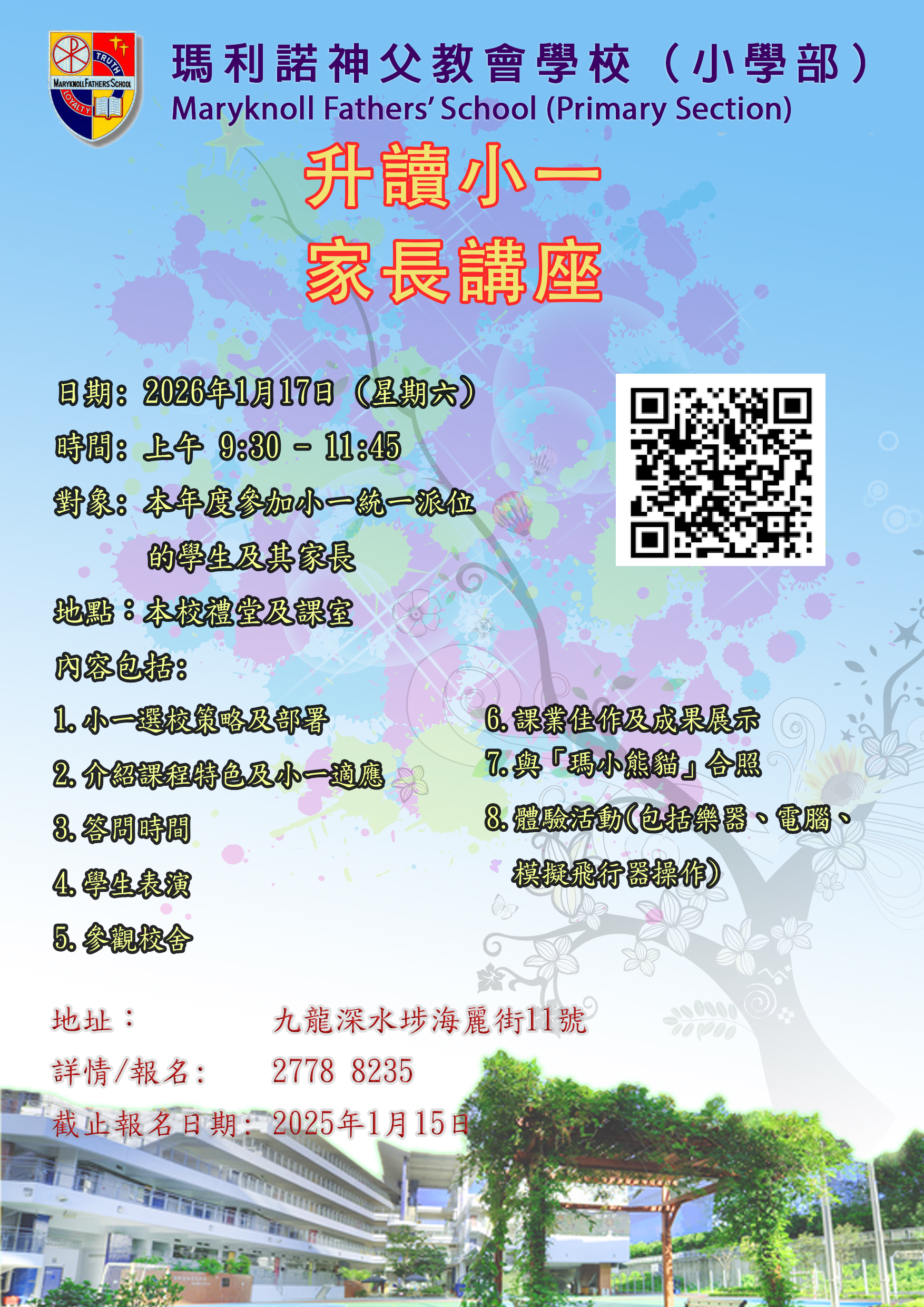 | 備註 | 為讓各位能更有效地填寫「統一派位」選校表格,現邀請家長及小朋友,於2026年1月17日(星期六)上午9時30分至11時45分到本校(九龍深水埗海麗街11號)參加「升讀小一家長講座」,詳情請參閱有關海報。 報名連結:https://docs.google.com/forms/d/e/1FAIpQLSccFvo-VzfiOXo5A3T45Jm1BfXm47cSHGFdoSVJDIzoJ-Kt3w/viewform |