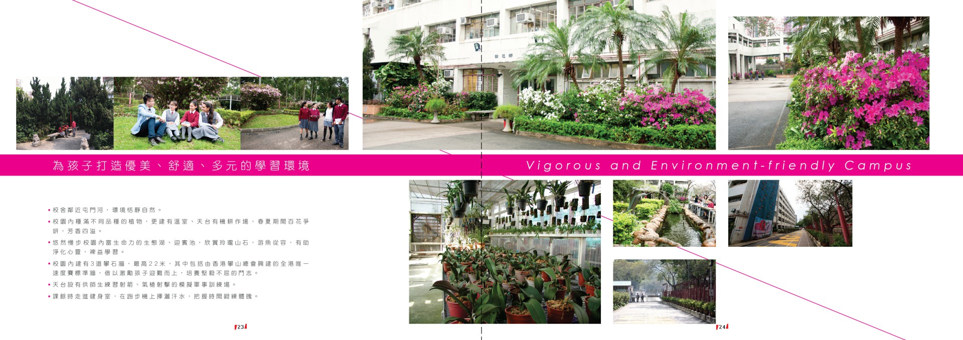 | 環保政策 | : | 學校透過體驗為主、活動為本的策略推動環保教育,成績顯著,榮獲2003年香港綠色學校冠軍、2008年香港中小學環保成就獎、2008/09、2009/10及2011/12可持續發展學校獎勵計劃金獎、2010年香港環保卓越計劃界別卓越金獎及2012年積極推動可持續發展榮譽大獎。 |
